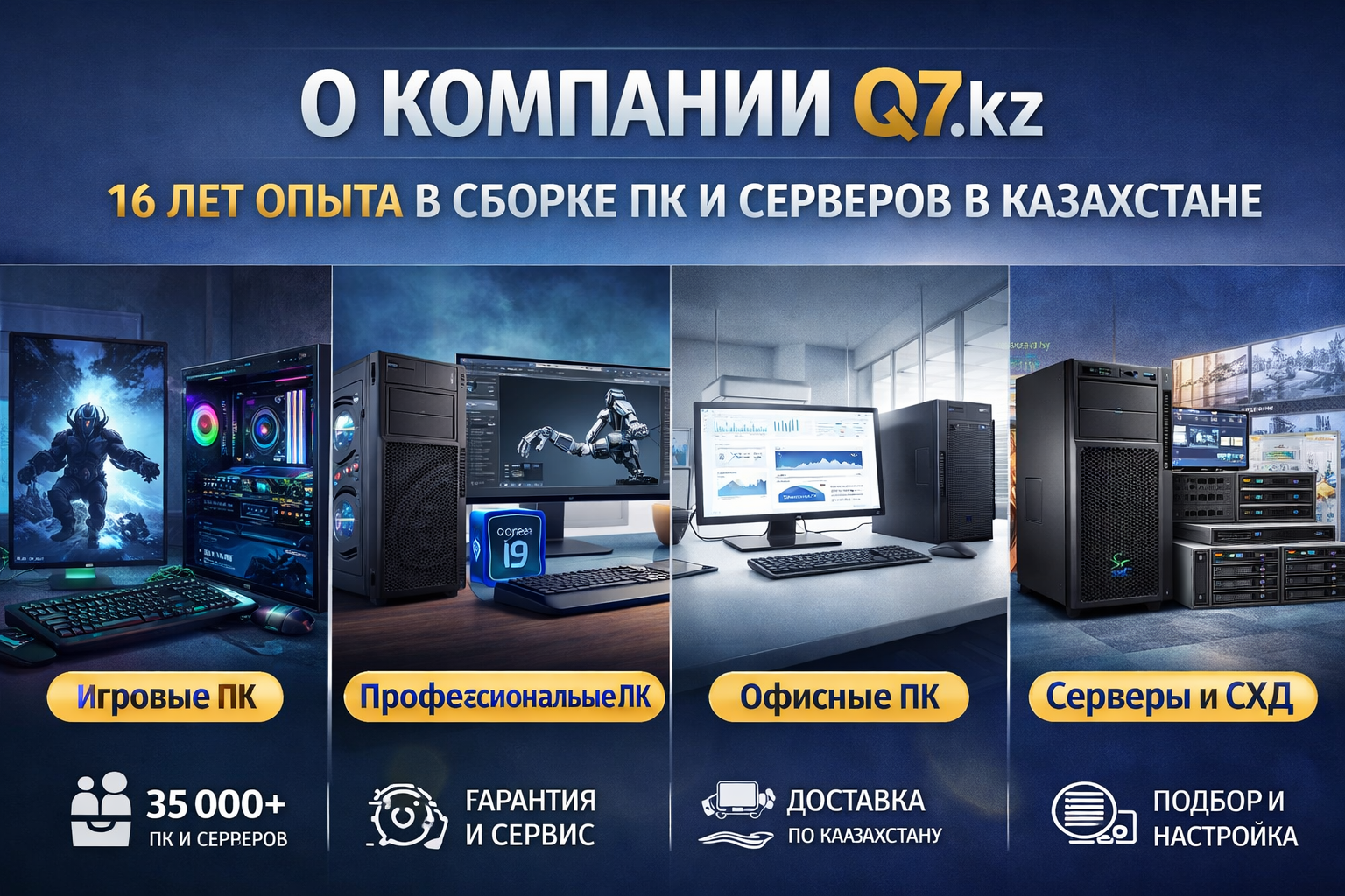 Компания Q7.kz более 16 лет занимается сборкой и продажей компьютеров в Алматы и по всему Казахстану. За это время мы собрали более 40 000 ПК и серверов для офиса, дома, геймеров и профессионалов. Мы предлагаем только качественные комплектующие, гарантию и настройку под ключ.